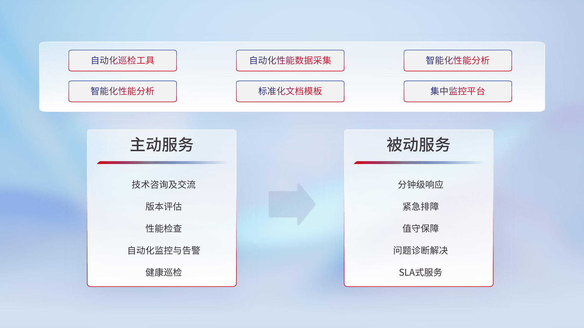 智能化工具和标准化文档,,,保障服务质量,,提供主动服务(包含技术咨询、、、、版本评估、、性能检查、、、、自动化监控与告警、、健康巡检)和被动服务包含(分钟级响应、、、紧急排障、、、值守保障、、问题诊断解决、、SLA服务)。。
